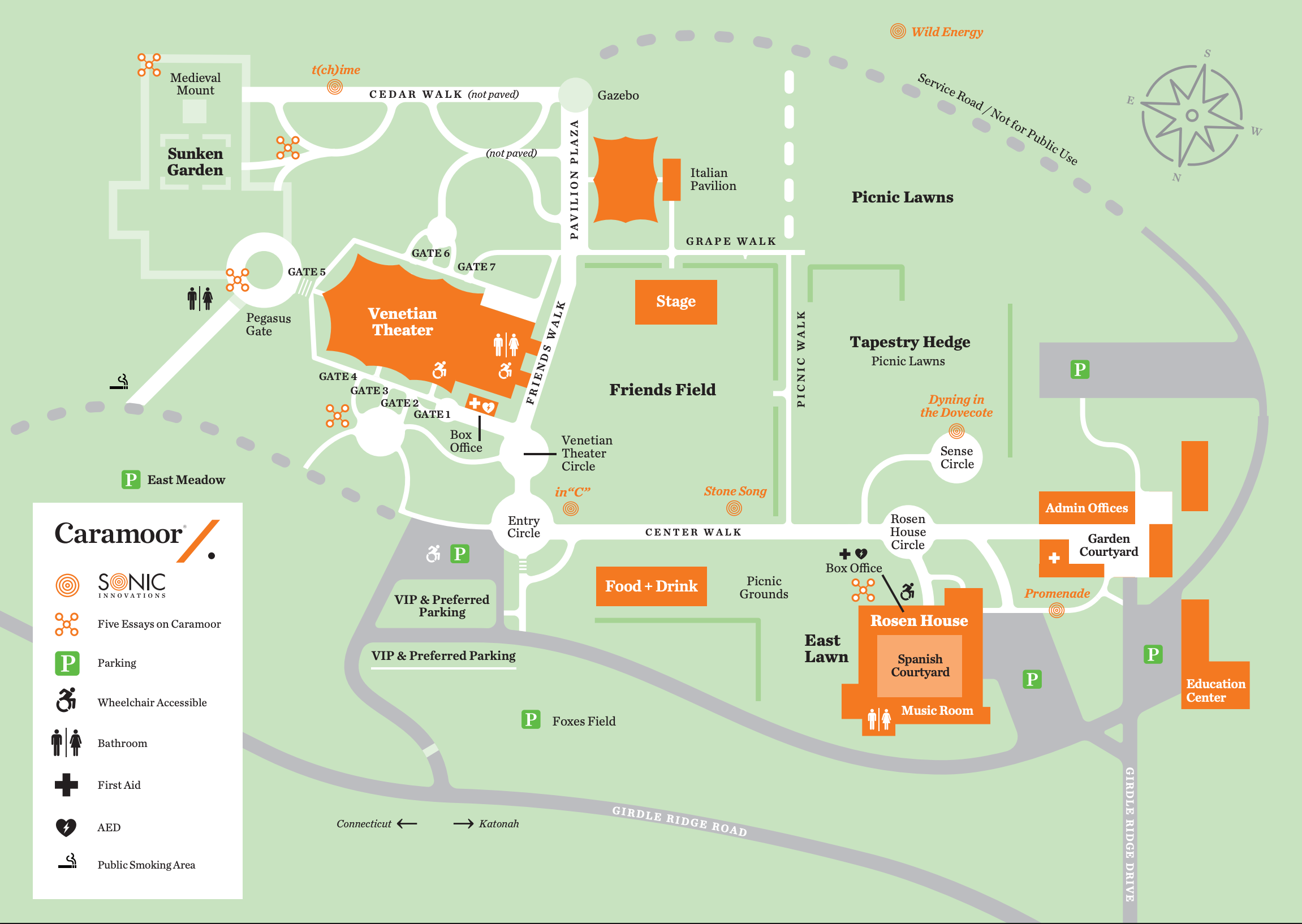 Our grounds are open for picnicking, walking, and exploring daily from 10:00am – 4:00pm. Across Caramoor, you’ll find gardens, historical features, and Sonic Innovations installations. You’ll find tables to dine on the Pavilion Patio year-round and picnic tables on East Lawn and the Picnic Lawn in the fair-weather months. The Pegasus Gates, Italian Pavilion, and Cedar Walk Gazebo are features the Rosens enjoyed when this was their country estate. Sculptures of Zephyr and Flora are tucked into The Tapestry Hedge which also features a peony and iris border blooming in late spring, a pergola covered in roses in summer, and the sensory garden surrounding the dovecote fountain in the Marjorie Carr Adams Sense Circle. Throughout the grounds, you will find our seasonal Sonic Innovations sound art installations